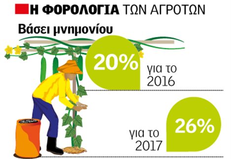 Σύμφωνα με το κείμενο που έφερε στη δημοσιότητα η Καθημερινή, στο «πακέτο» των προαπαιτούμενων που θα πρέπει να ψηφιστούν τον Οκτώβριο από τη Βουλή προβλέπει αύξηση του συντελεστή φορολόγησης των αγροτών, αρχικά στο 20% για το 2016 (δηλαδή για τα εισοδήματα του 2015) και εν συνεχεία στο 26% από το 2017 και μετά. Πρόκειται για διπλασιασμό του συντελεστή 13% που ισχύει σήμερα.